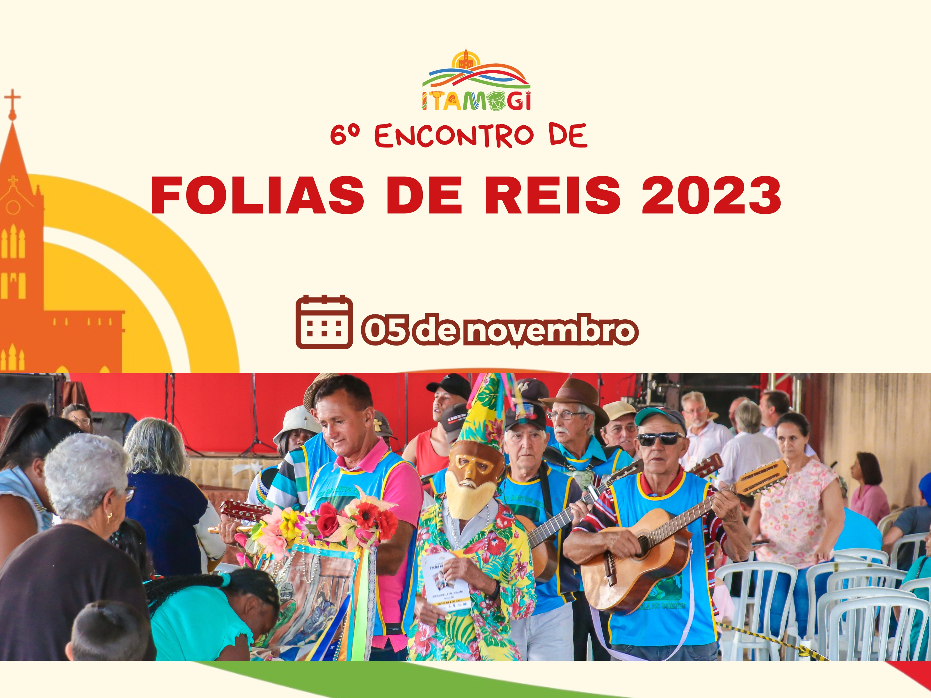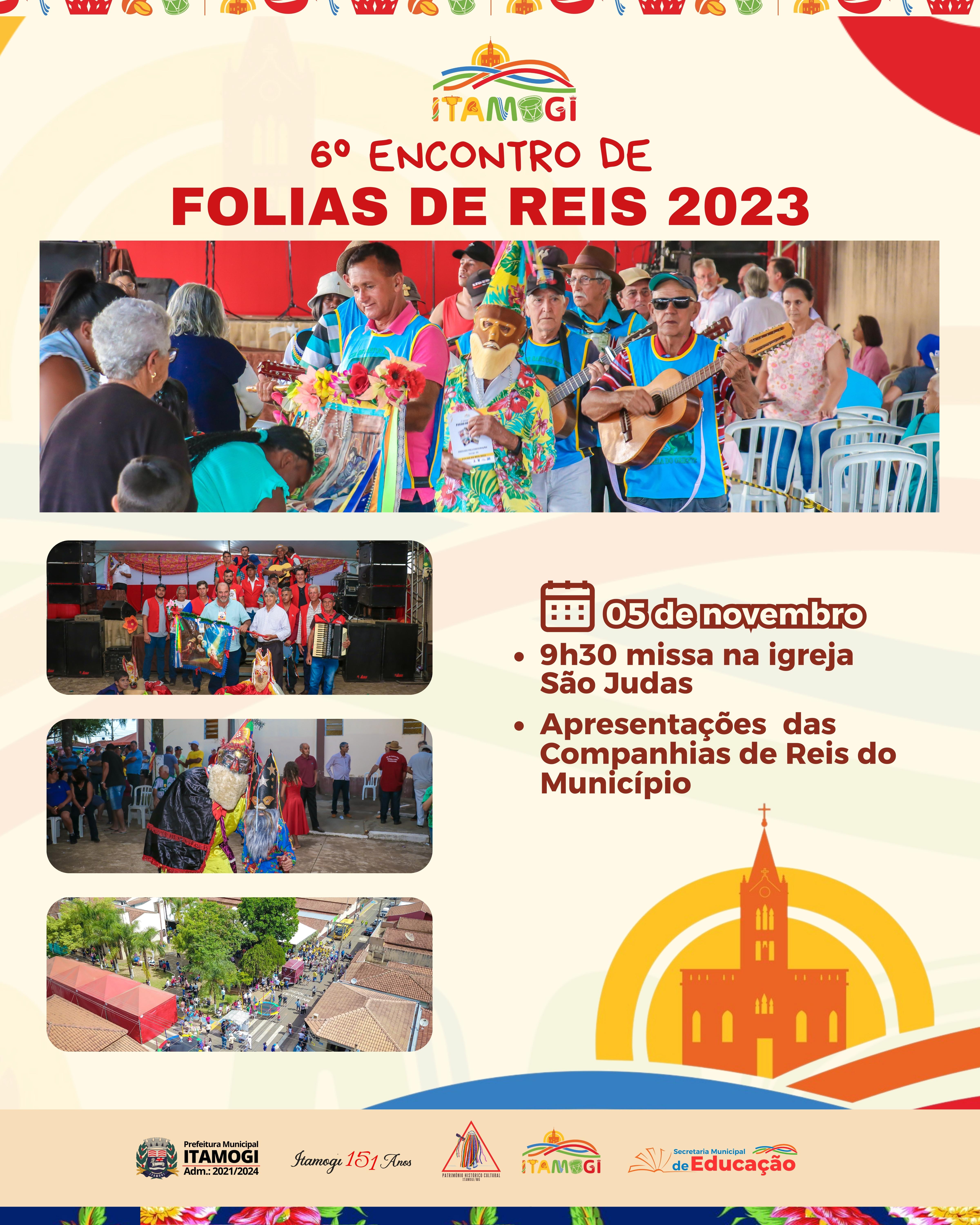 Notícias 6º Encontro de Folias de Reis 2023 30 de outubro de 2023 A Prefeitura Municipal de Itamogi, convida a todos para o grandioso Encontro de Folias de Reis 2023. O 6º Encontro de Folias de Reis será realizado na Praça São Judas, no Bairro Vale do Sol, logo após a missa que terá início as 9h30.