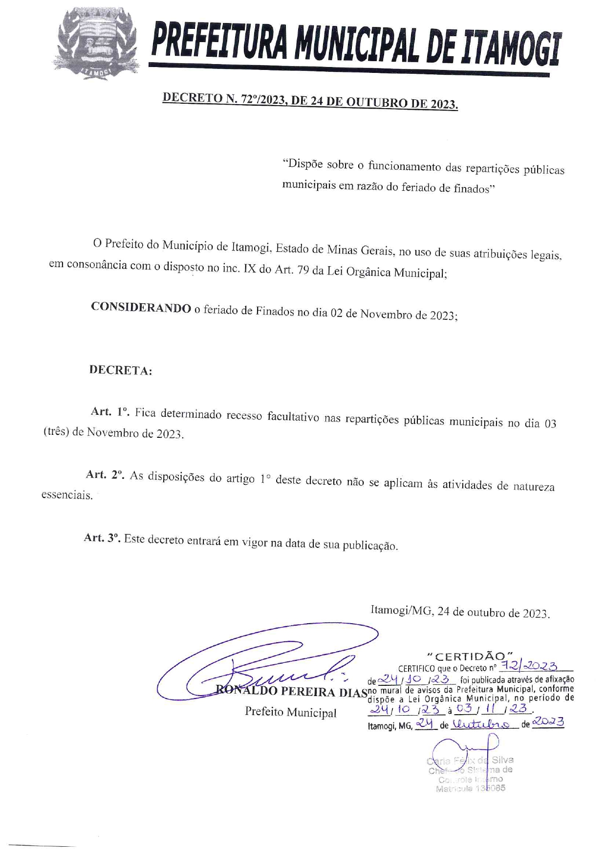 CONSIDERANDO o feriado de Finados no dia 02 de Novembro de 2023: