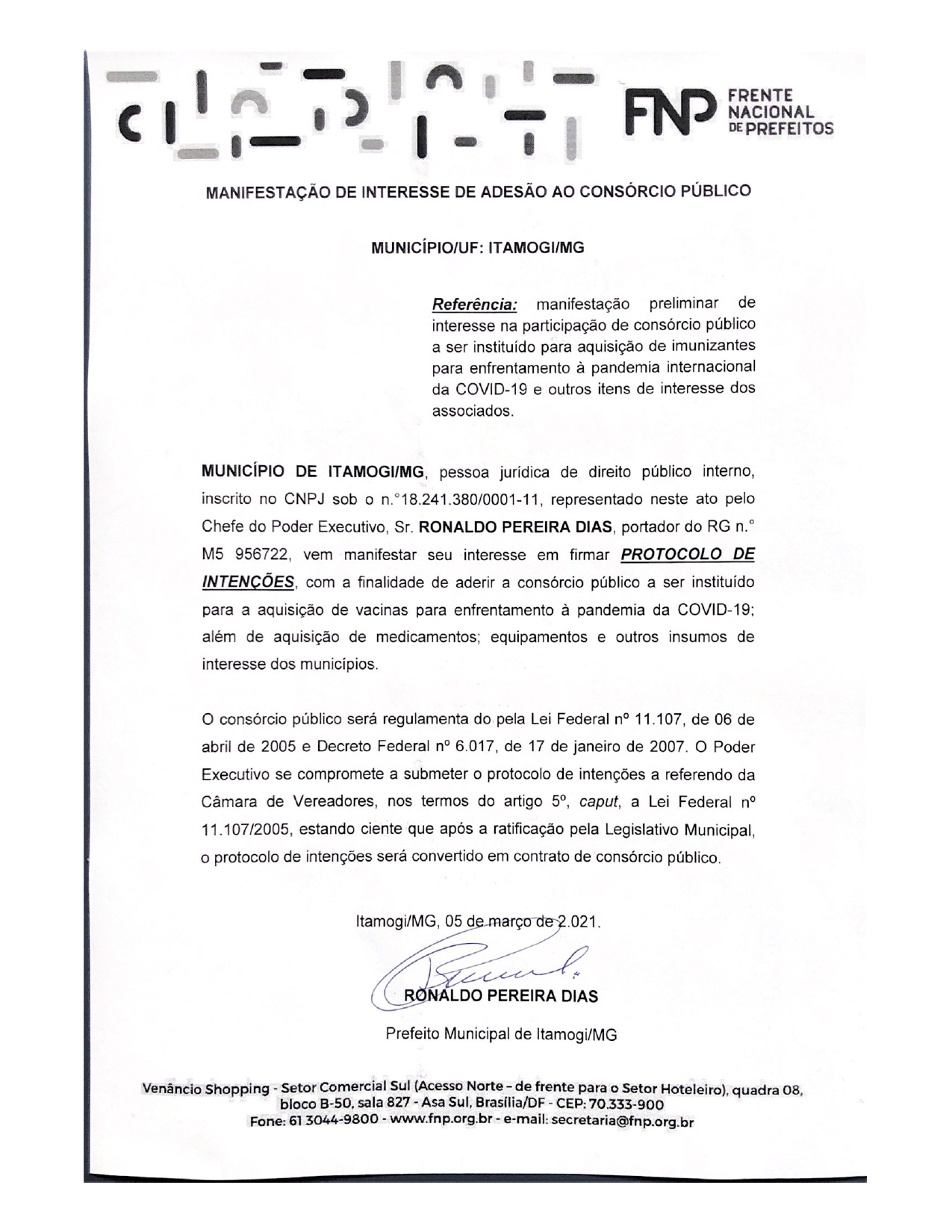 A Prefeitura Municipal de Itamogi assinou, na manhã desta sexta-feira, 05 de março, protocolo de intenção junto a Frente Nacional de Prefeitos, com a finalidade de aderir a Consórcio Público a ser instituído.