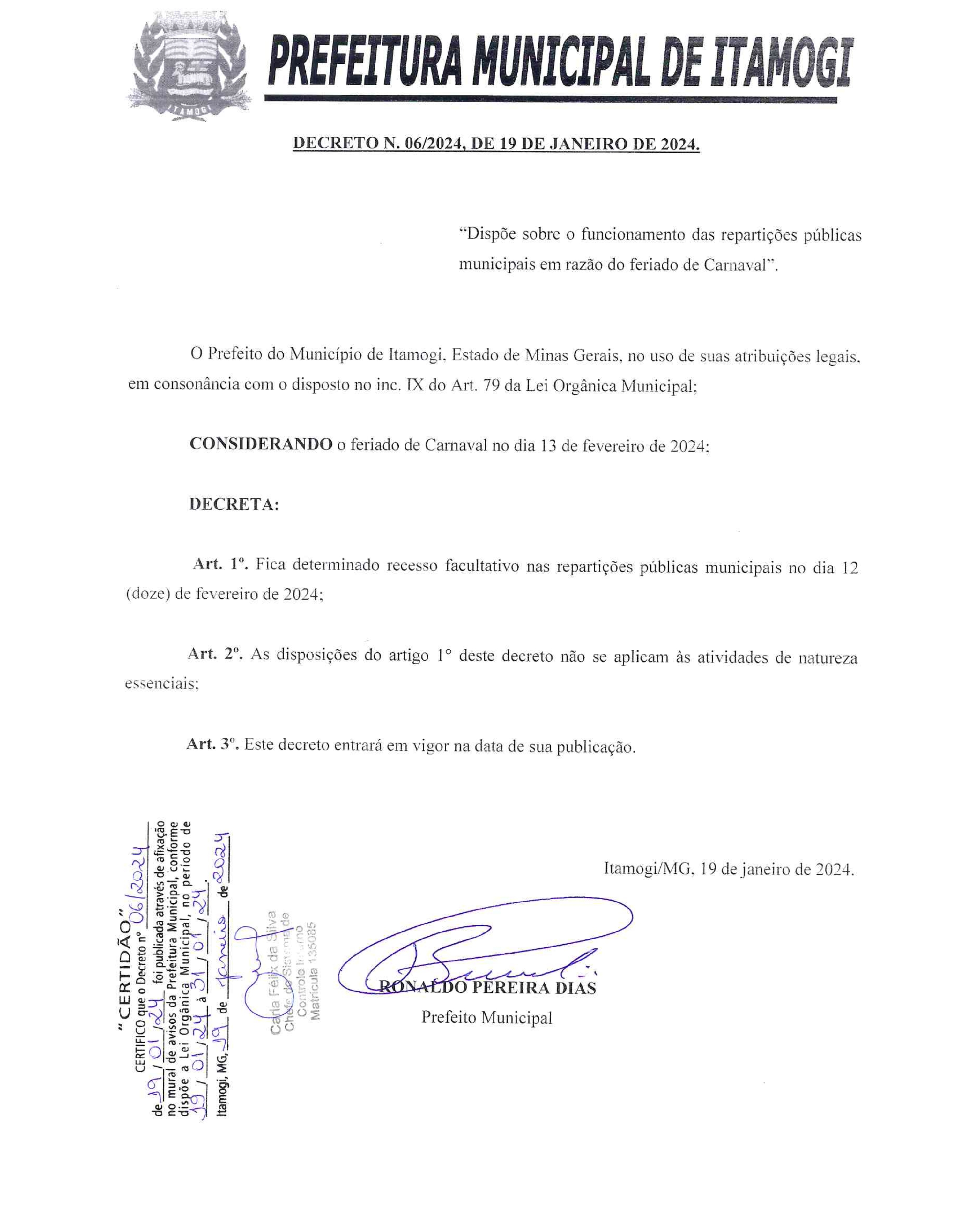 DECRETO N .06/2024 – “Dispõe sobre o funcionamento das repartições públicas municipais em razão do feriado de Carnaval”.