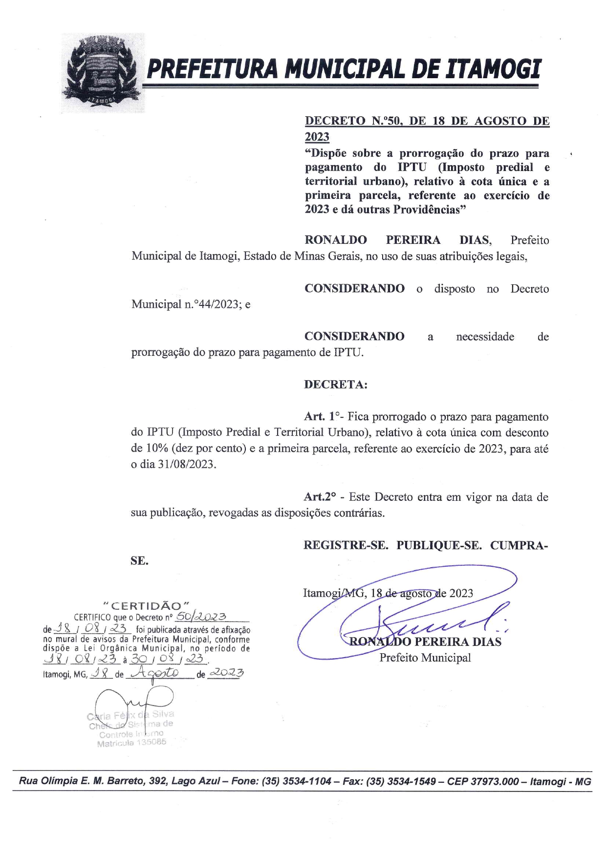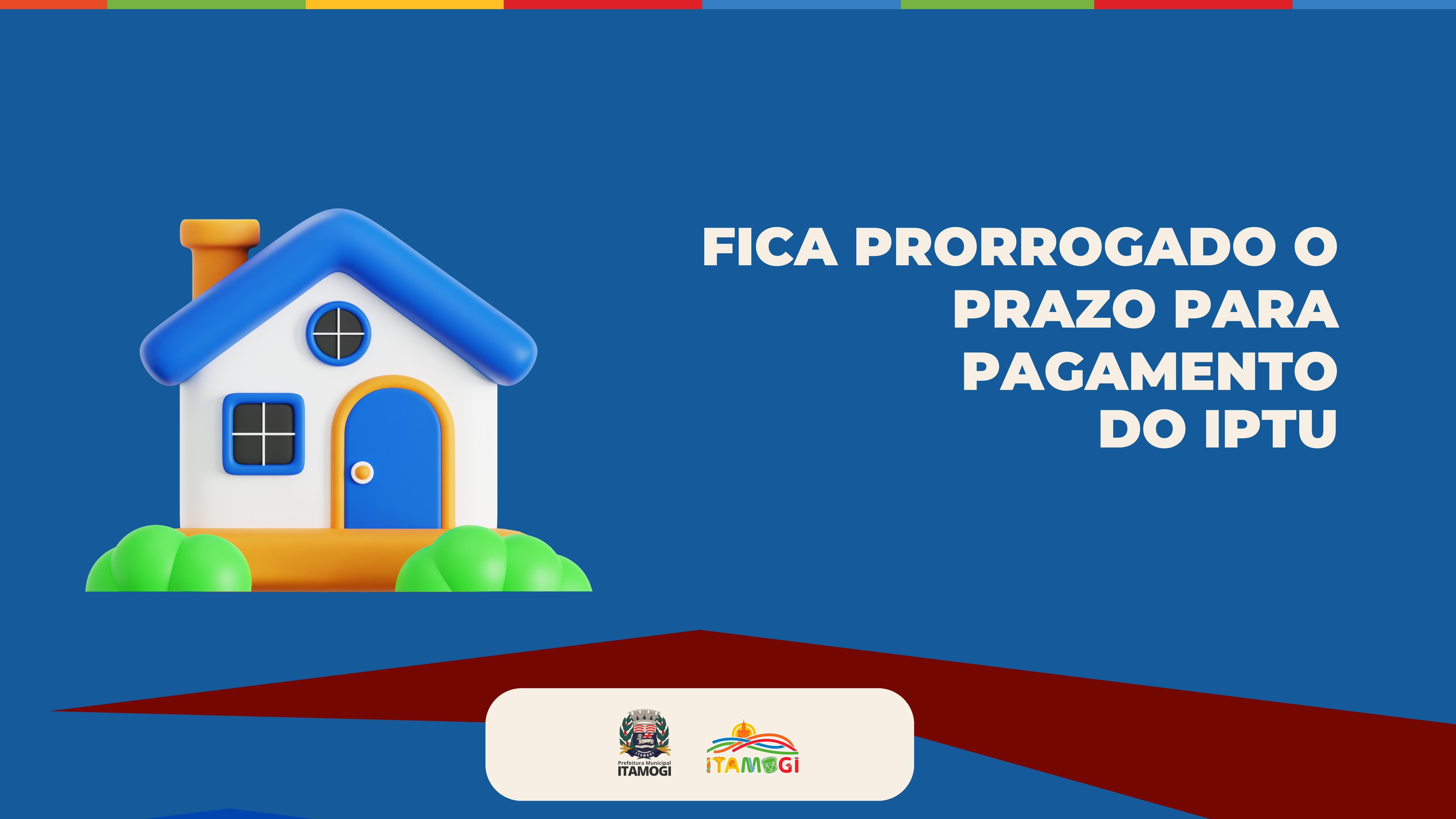 Notícias Fica prorrogado o prazo para pagamento do IPTU 18 de agosto de 2023 Fica prorrogado o prazo para pagamento do IPTU (Imposto Predial e Territorial Urbano), relativo à cota única com desconto de 10% (dez por cento) e a primera parcela, referente ao exercício de 2023, para até o dia 31/08/2023.