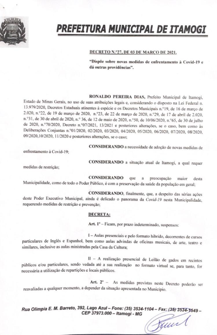 No final da tarde de quarta-feira, 03 de março de 2021, a Prefeitura Municipal de Itamogi, publicou o decreto nº 27 que dá novas providências sobre a suspensão de aulas e cursos e também prevê a proibição da realização de forma presencial de leilões de gado, em recintos públicos ou particulares.