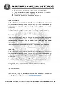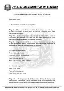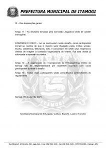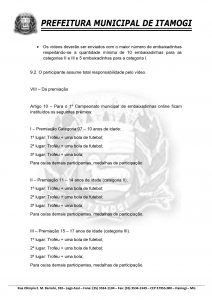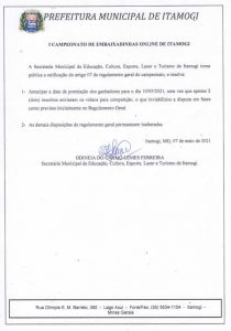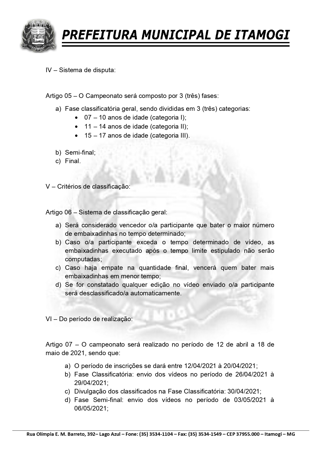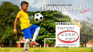 Com a finalidade de difundir a prática de esportes de forma sadia e incentivar a atividade física entre crianças e adolescentes, a Administração Pública, através da Secretaria Municipal de Educação, Cultura, Esporte, Lazer e Turismo realiza o I Campeonato de Embaixadinhas Online de Itamogi.