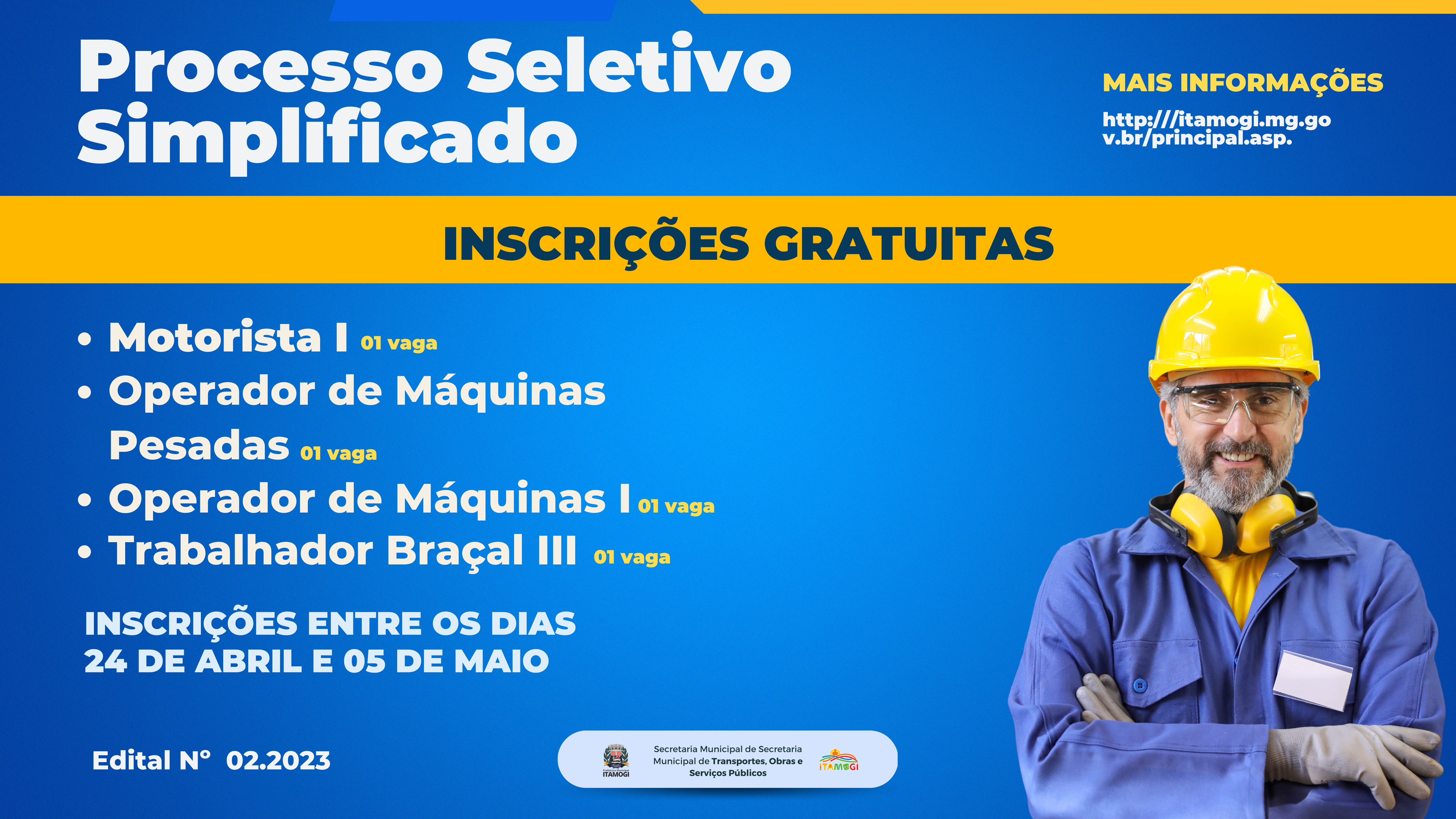 A Prefeitura Municipal de Itamogi, através da Secretaria Municipal de Transportes, Obras e serviços Públicos, abre processo seletivo contratação temporária,