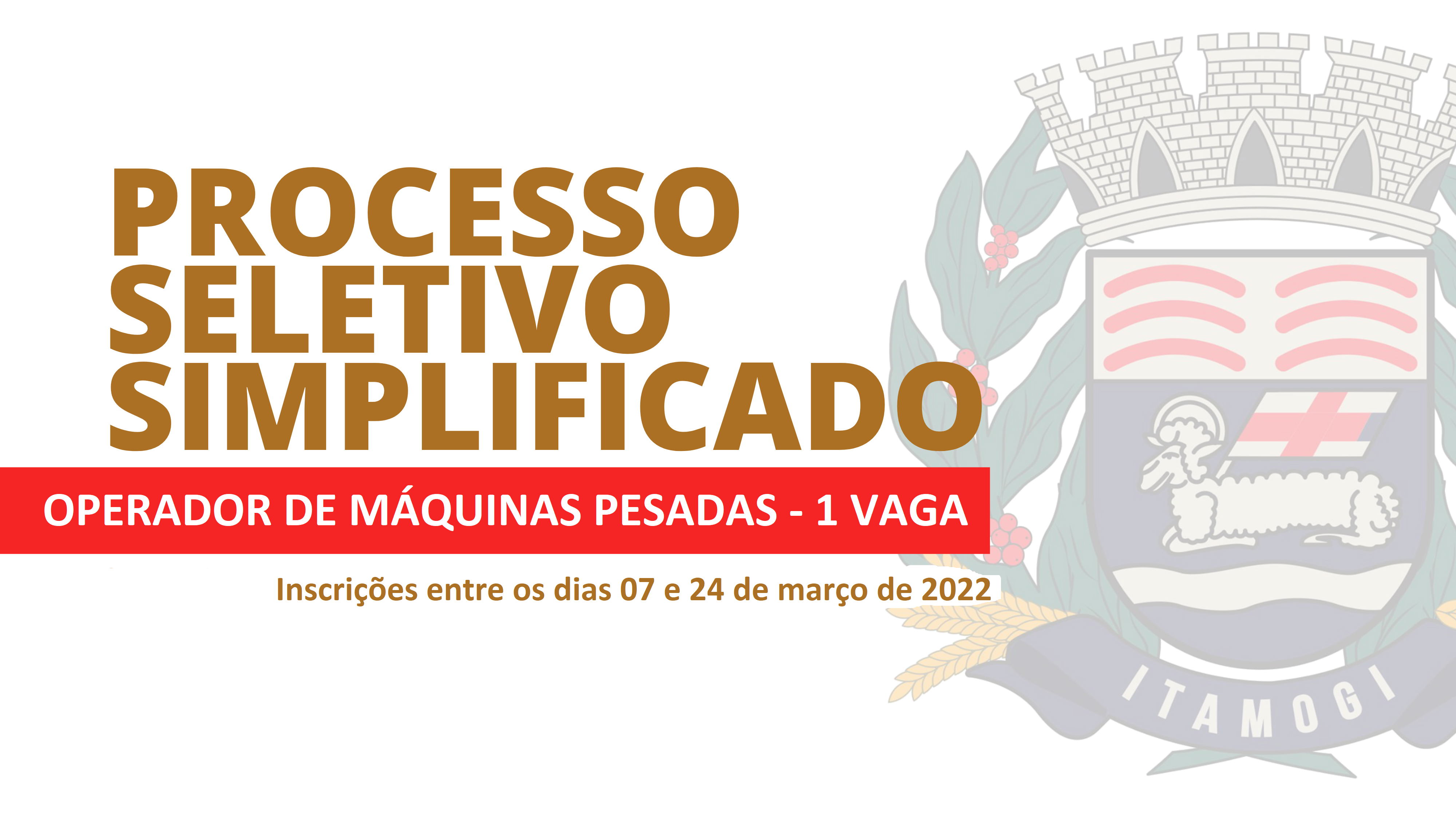 A Prefeitura Municipal de Itamogi/MG, visando evitar prejuízos de solução de continuidade dos trabalhos desenvolvidos pela Secretaria de Viação, Obras e Serviços Urbanos na estruturação dos serviços desenvolvidos por esta importante pasta, faz saber que do dia 07/03/2022 a 24/03/2022, nos termos deste edital, abrirá Processo Seletivo Simplificado para a contratação Temporária, nos termos da Lei Municipal nº 671/98, que regulamenta a contratação temporária de pessoal, visando o preenchimento de 01(uma) vaga para o cargo de Motorista e 01 (uma) vaga para o cargo de Operador de Máquinas Pesadas, ficando todos os interessados convocados para a realização de provas práticas.
