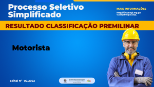 Processos Seletivos RESULTADO CLASSIFICAÇÃO PRELIMINAR – MOTORISTA – Processo Seletivo Simplificado N.002/2023 9 de maio de 2023 Processo Seletivo Simplificado N.002/2023, MOTORISTA. RESULTADO CLASSIFICAÇÃO PRELIMINAR Para acessar o resultado aqui